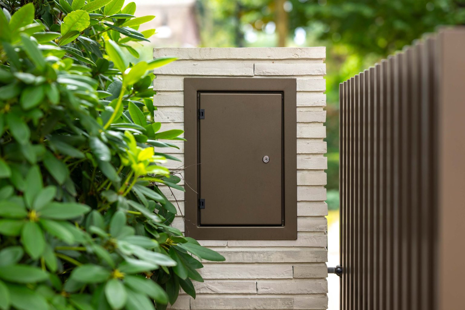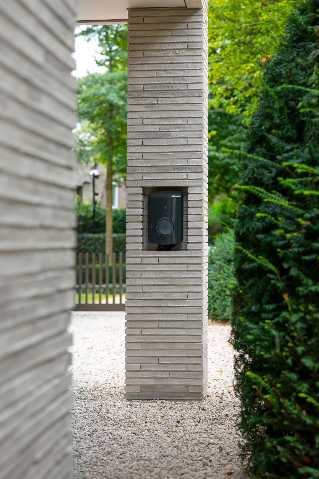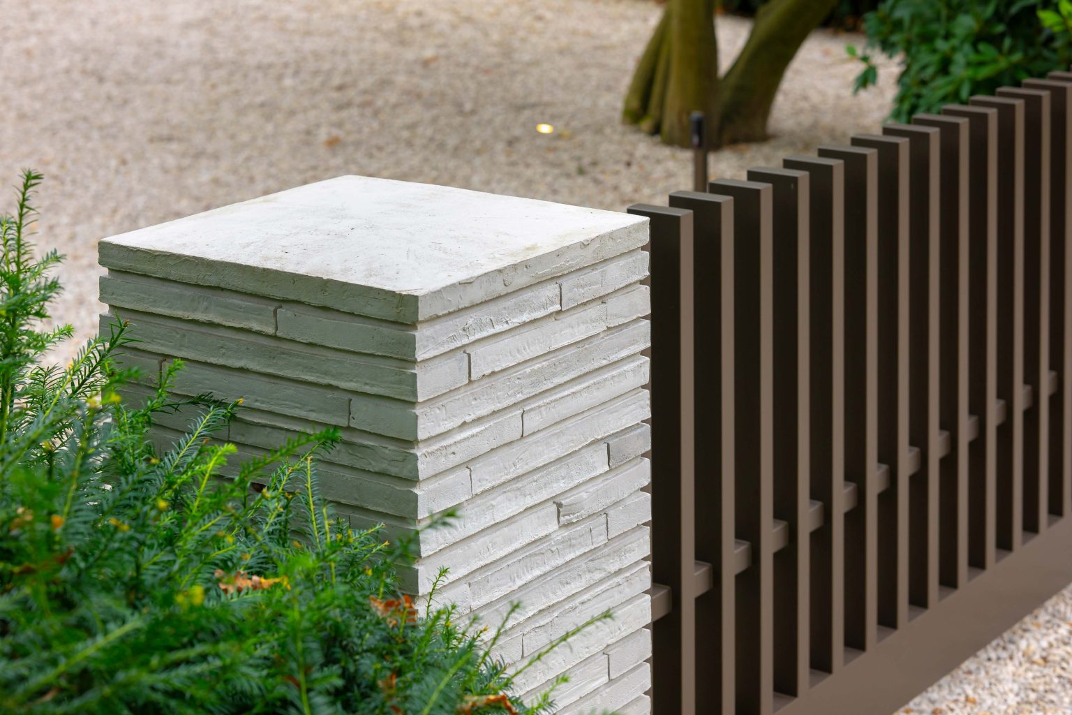 Bij het ontwerp van de poort kwam de vraag op tafel: zouden we ook de afdekplaat van de paal op maat kunnen bakken, in plaats van een meer standaard oplossing zoals Belgisch natuursteen? Tom: “We vonden het een mooie uitdaging. In overleg met de fabriek hebben we besloten het te doen – ondanks het risico, want zulke grote platen kunnen tijdens het bakproces makkelijk breken.” De afdekplaat is speciaal ontworpen en loopt iets bol, zodat het water goed wegloopt. Zo blijft niet alleen het uiterlijk strak en consistent, maar is het ook technisch goed doordacht. Hadden we een andere kleisoort gehad dan was dit wellicht niet gelukt.