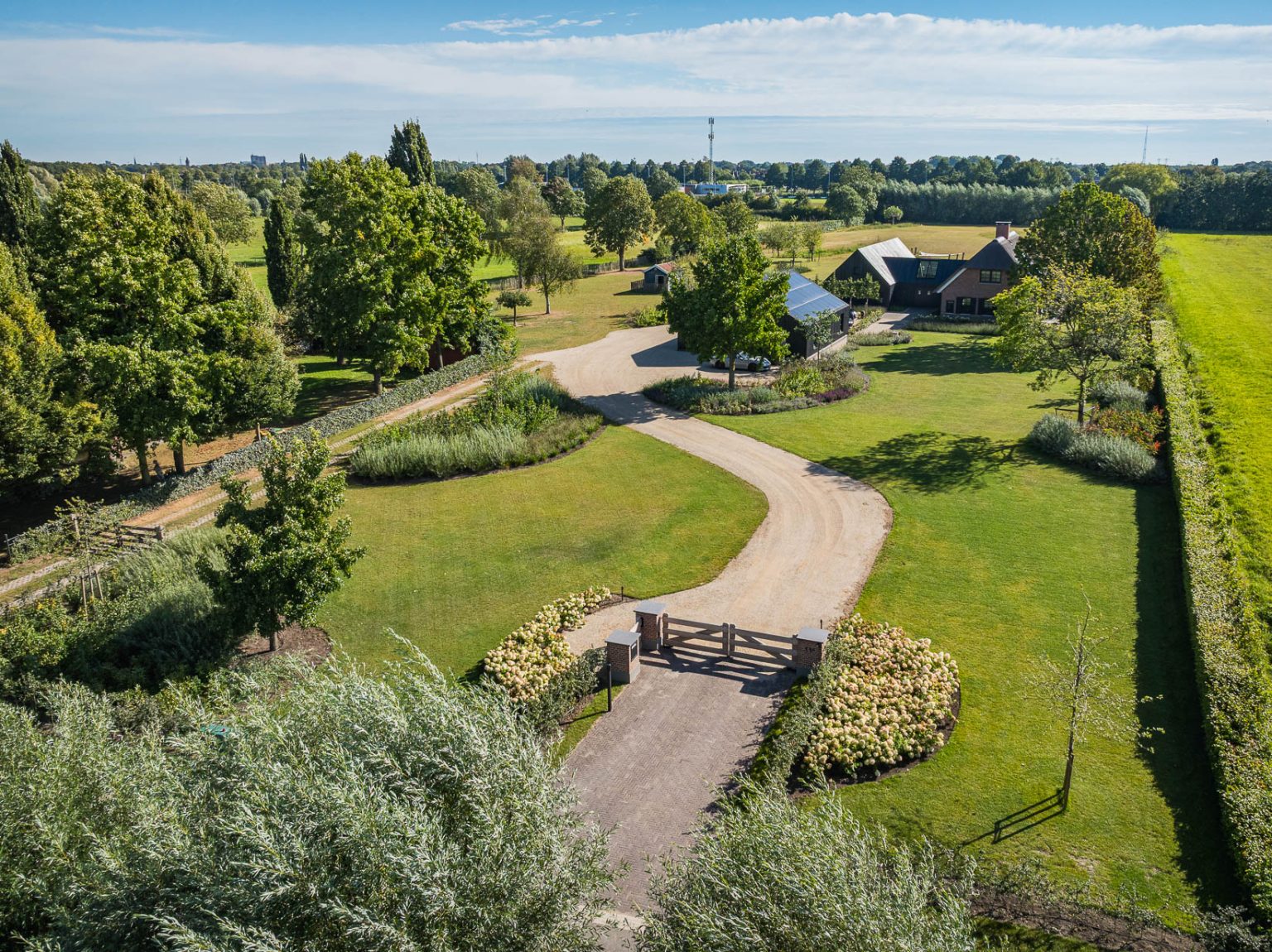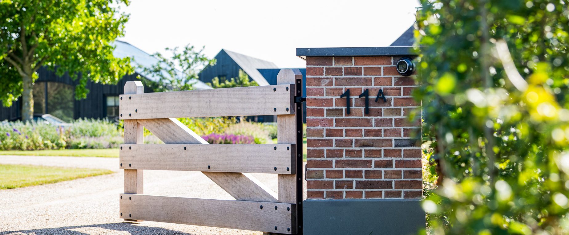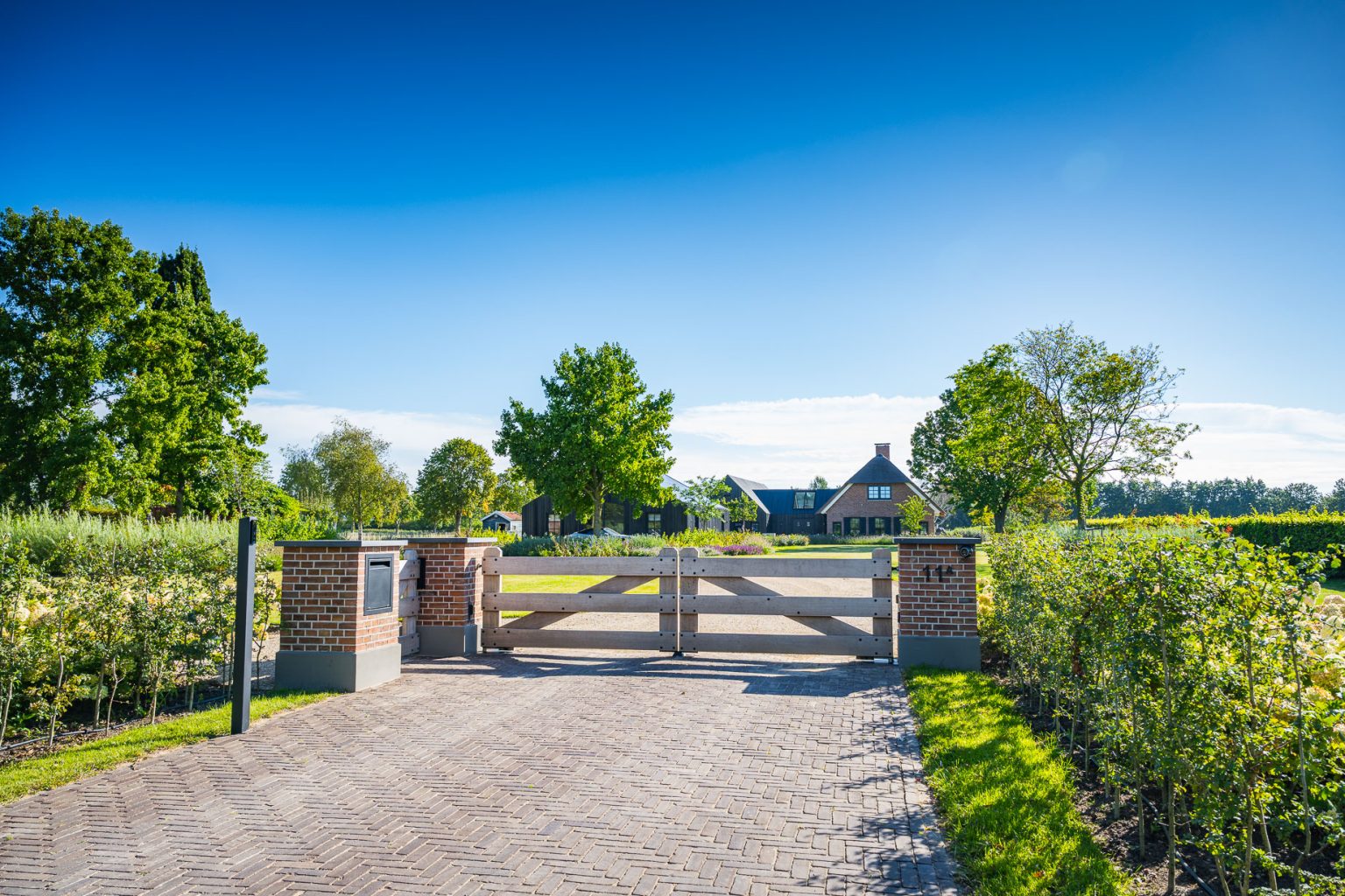 In de IJsseldelta bij Zwolle hebben we een toegangspoort geplaatst met een landelijke uitstraling. De poort is opgebouwd uit robuuste houten balken die perfect passen bij het natuurlijke karakter van de omgeving. De gemetselde poeren zijn opgebouwd met karaktervolle stenen van Petersen Tegl en afgewerkt met een strakke snijvoeg, wat zorgt voor een tijdloze en hoogwaardige afwerking.
