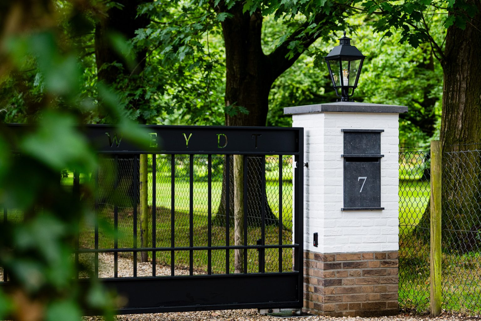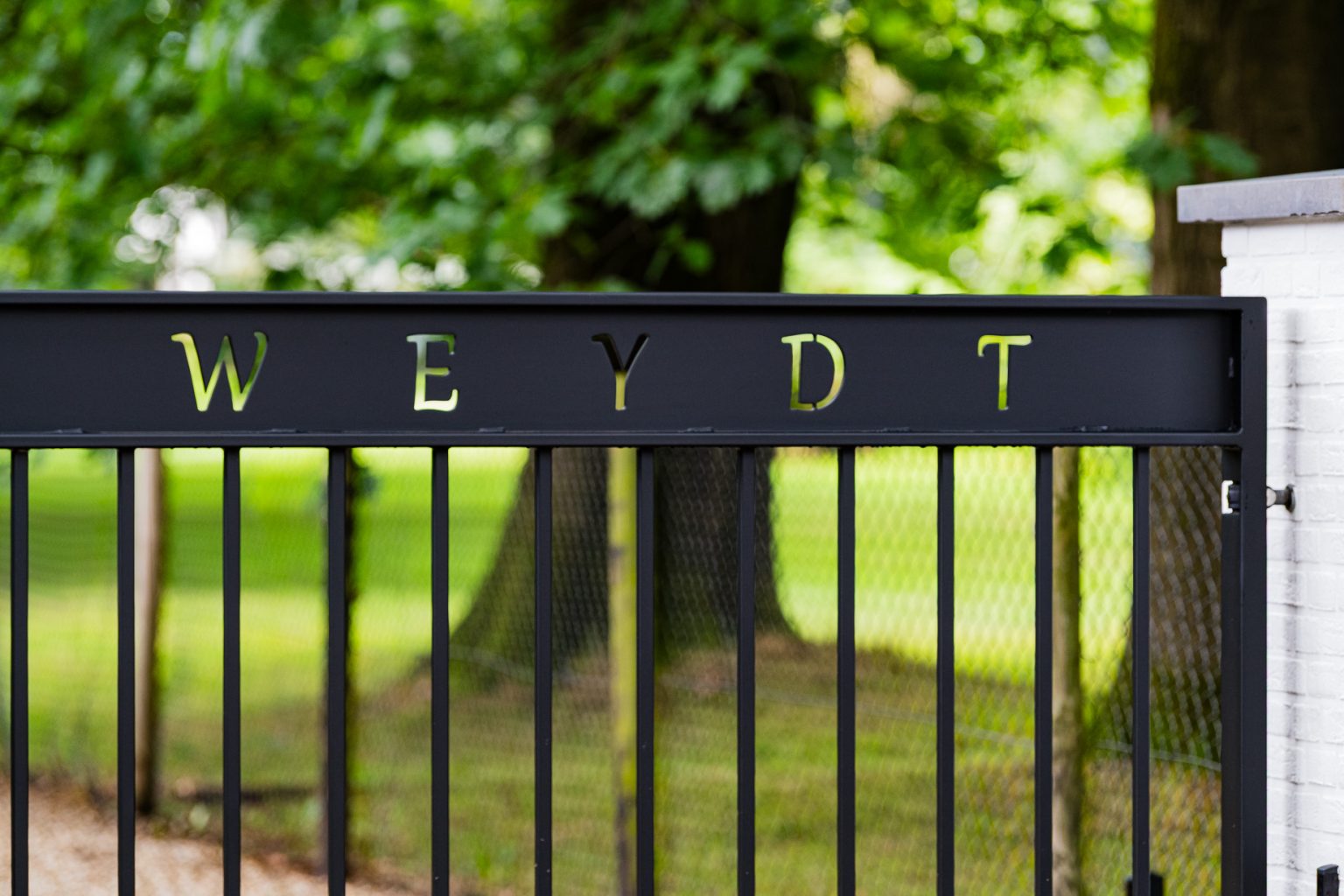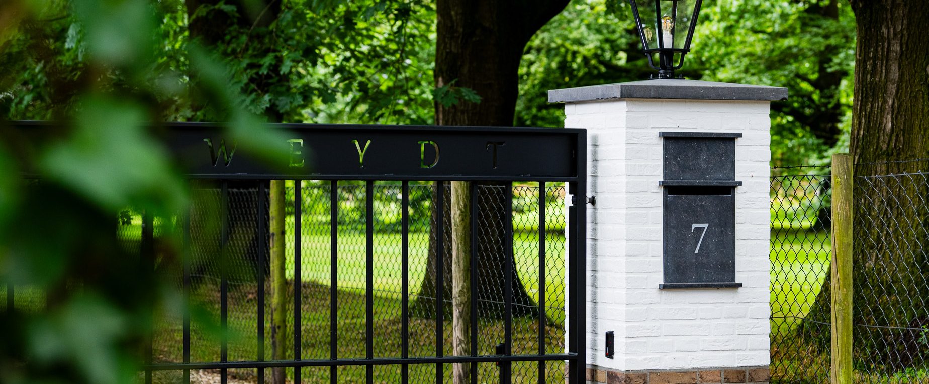 Op een verhoogde terp op de Veluwe staat de woning genaamd Hoghe Weydt, verscholen tussen de bomen. Een lange oprijlaan slingert zich ernaartoe, statig en uitnodigend. Aan het begin ervan prijkt een bijzondere poort, die wij met trots hebben gerealiseerd. Tussen het groen door vang je net een glimp op van de woning — ingetogen, maar groots. Dat de poort het werk is van een architect, zie je meteen aan de verfijnde lijnen en het doordachte ontwerp.